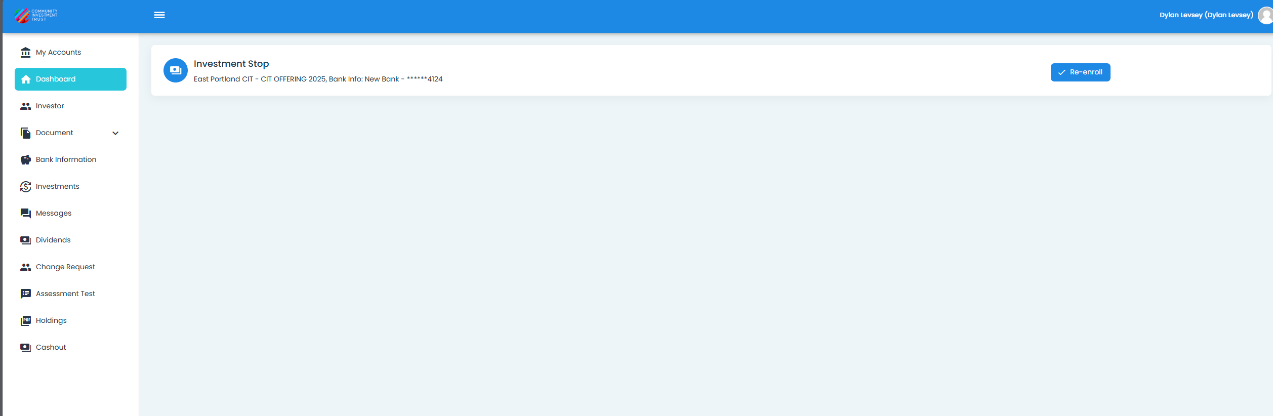 Dashboard# The Section: Dashboard section for Investors allows Investors to: View all their investments, Check investment statuses, Re-enroll in investments, De-Enroll in investments Dashboard, Investors, One Investment#