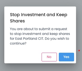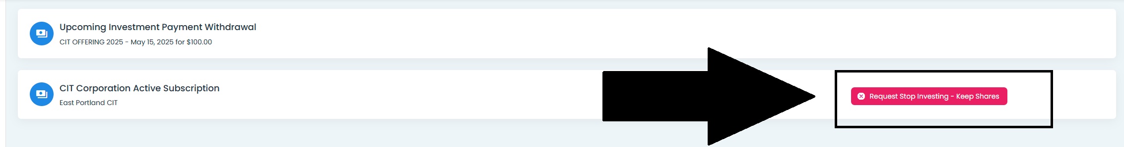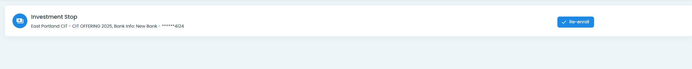 De-Enrollment Instructions# Follow the instructions below to de-enroll in an investment: 1. Find the investment you want to de-enroll in.# 2. Click on the De-enroll button# Click on the De-enroll button for the investment you want to enroll or denroll from. Dashboard, De-Enroll Button Location# 3. Answer the pop-up message# Answer the pop-up message by clicking either the Item: Yes or Item: No selections. Dashboard, De-Enroll Pop-up# Action Complete You have successfully de-enrolled in the investment. You should see the following as a result: Dashboard, De-Enroll Action Complete#